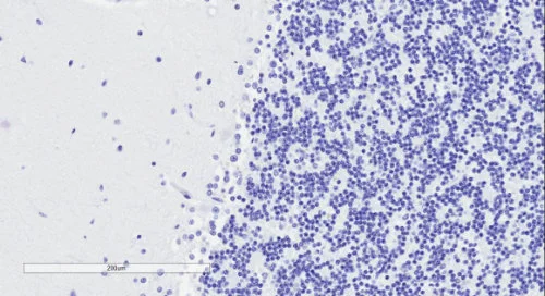 EB10781 (2µg/ml) staining of paraffin embedded Human Cerebellum. Microwaved antigen retrieval with citrate buffer pH 6, HRP-staining.